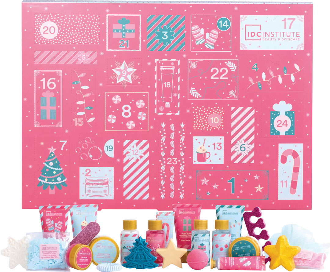 Adventný kalendár dámsky IDC Institute Beauty & Skincare obsahuje: 30ml telové mlieko, 30ml šampón, 30ml kondicionér na vlasy, 30ml sprchový gél, 30ml telový peeling, 30ml peeling na tvár, 30ml hydratačná voda na tvár, 30ml krém na ruky, 20ml telové maslo, 20ml krém na nohy, 10g balzam na pery, 10ml krém na tvár, 8ml gélová maska na tvár, mydlo v tvare hviezdice, mydlo v tvare stromčeka, bomba do kúpeľa v tvare hviezdy, bomba do kúpeľa so snehovými vločkami, soľ do kúpeľa, konfety do kúpeľa, bomba do kúpeľa, špongia do kúpeľa, oddeľovač prstov,, pilník na nechty, spona do vlasov