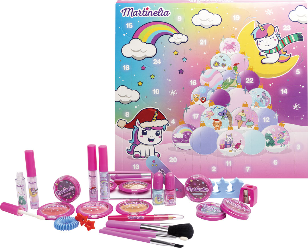 Adventný kalendár Martinelia obsahuje 3 lícenky 3g, 4 očné tiene 2g, 4 lesky na pery 0,8ml, 1 pilník na nechty, 1 gumička do vlasov, 1 strúhadlo na ceruzky, 1 sponka do vlasov, 1 zrkadlo, 1 oddeľovač prstvo na nohách, 1 ceruzka na pery, 4 štetce, 2 laky na nechty