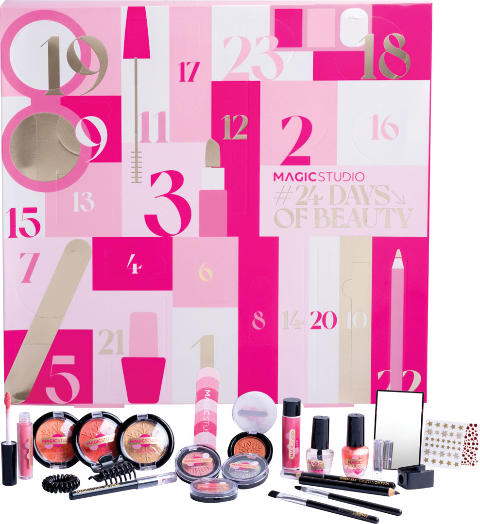 Adventný kalendár Magic studio obsahuje: 1 rozjasňvač make-upu, 2 lícenky, 3 očné tiene, 2 lasky na pery, 1 lak na nechty, 1 balzam na pery, 1 pilnik na nechty, 1 špirálová gumička do vlasov, 1 strúhadlo, 1 hubka, 1 sponka do vlasov, 1 zrkadlo, 1 štetec na púder, 1 štetec na obočie, 3 štetce na očné tiene, 1 ceruzka na oči, 1 nalepovacie drahokamy, 1 nálepky na nechty.