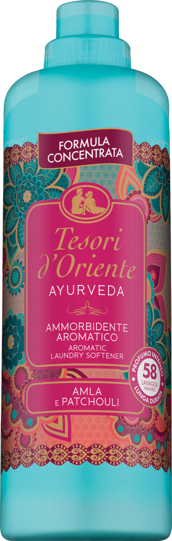 Tesori d'Oriente Ayurveda koncentrovaná aviváž na prádlo 58 praní 1160ml. Obsahuje mikro-kapsule, ktoré zanechávajú na prádle intenzívnu a nezameniteľnú vôňu Tesori d'Oriente. Jej krémové zloženie bez syntetických farbív uvoľňuje tkaniny a uľahčuje žehlenie. Obsah chrómu, niklu a kobaltu je nižší než 0,00001 %.