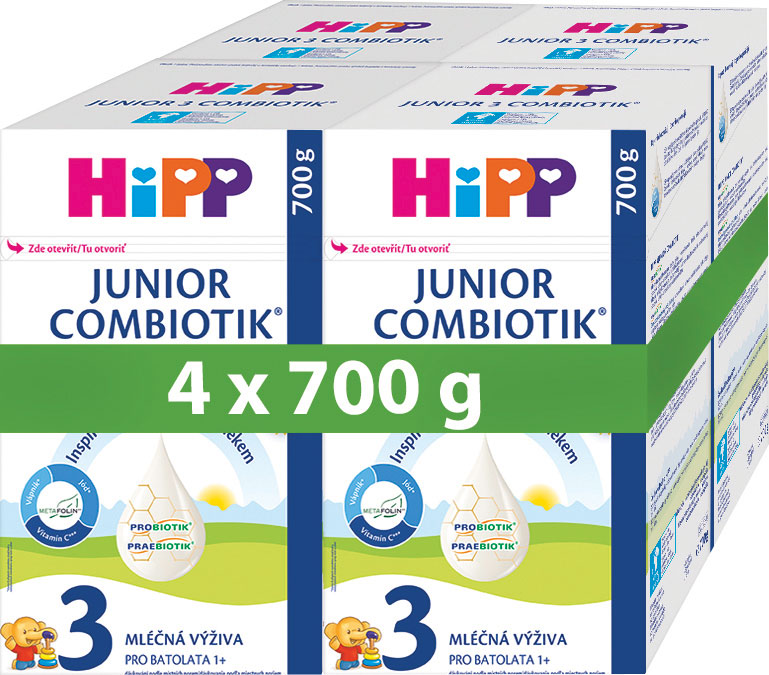 Nevhodné pre výživu detí do ukončeného 12. mesiaca. HiPP 3 JUNIOR COMBIOTIK® je určený na pitie z hrnčeka, pre deti od ukončeného 12. mesiaca ako súčasť zmiešanej a vyváženej stravy. Dbajte na pravidelnú zubnú hygienu – obzvlášť pred spaním. Venujte pozornosť vyváženej strave a zdravému spôsobu života vášho dieťaťa. Mliečny nápoj s odtučneným mliekom a rastlinnými olejmi pre malé deti od 1 roku v prášku.