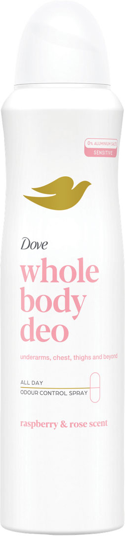 Objav jemnú starostlivosť s dezodorantom na celé telo od Dove s vôňou maliny a ruže. Tento sprej je navrhnutý na každodenné použitie na citlivé miesta ako podpazušie, hrudník, nohy a ďalšie časti tela. Neobsahuje hliník, je dermatologicky testovaný a vhodný aj pre citlivú pokožku.