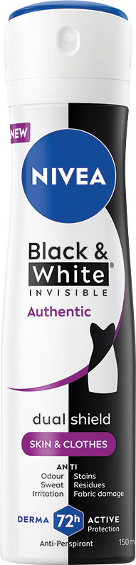 Sprej antiperspirant Black & White Authentic vás ochráni pred pachom potom a podráždením. Jemná starostlivosť, ktorá funguje.