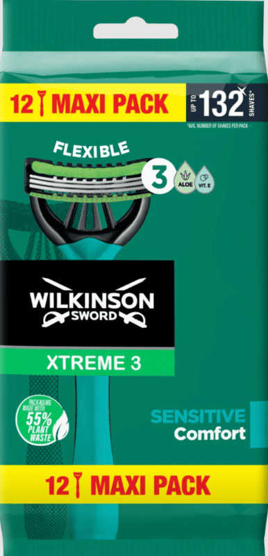 Jednorazový holiaci strojček Wilkinson Xtreme3 Sensitive pre citlivú pokožku, s 3 flexibilnými čepieľkami a flexibilnou hlavicou sa prispôsobí kontúram tváre. Zvlhčujúci prúžok s aloe vera a vitamínom E hydratuje a chráni pokožku pred podráždením. 12 ks v balení
