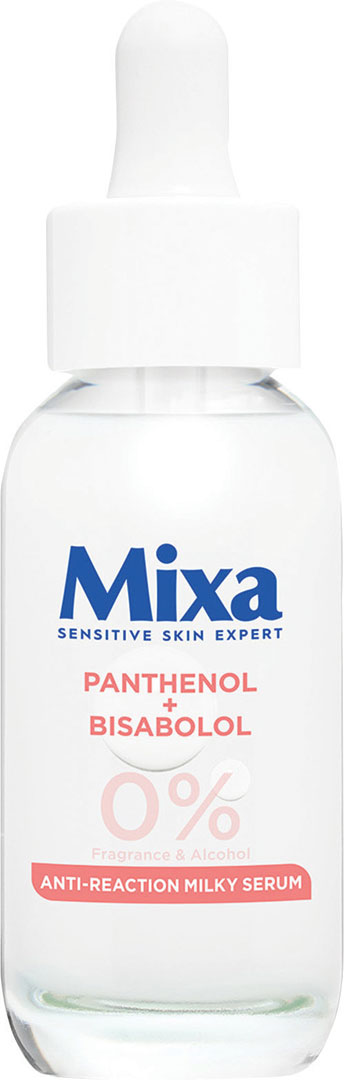 Mixa Anti-Reaction Upokojujúce mliečne sérum s pantenolom a bisabololom – okamžite pleť upokojuje a znižuje jej reaktivitu, vhodné pre citlivú pleť