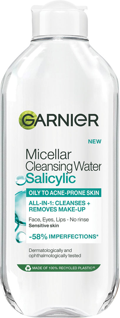 ALL-IN-1 čistiace riešenie proti nedokonalostiam: obohatený o kyselinu salicylovú, čistí a odstraňuje akýkoľvek typ make-upu z tváre, očí a pier, pričom zmatňuje pleť po celý deň bez zanechania zvyškov**. Viditeľné póry sa zdajú byť zmenšené a pupienky sú menej viditeľné bez vysušovania pokožky. Nedokonalosti sú znížené o -58 %***. Garnier sa zaväzuje k ekologickejšej kráse: Tento produkt je hypoalergénny, dermatologicky a oftalmologicky testovaný a je vhodný pre citlivú pleť a oči. Vegánska formula, bez krutosti, medzinárodne schválená. *Klinický test, 4 týždne, 45 dobrovoľníkov. **Spotrebiteľský test, 140 dobrovoľníkov. ***Klinický test na 45 ženách po 28 dňoch.