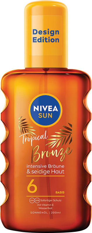 Chcete krásny zlatistý odtieň opálenia, ktorý vydrží aj dlho po návrate z dovolenky? Je to možné! Zlatistý odtieň dosiahnete ľahko. Použite olej na opaľovanie s karoténom a vitamínom E, ktorý zaistí tiež prirodzenú rovnováhu hydratácie a navyše krásne vonia. Navyše neobsahuje žiadne samoopaľovacie látky. Kožná znášanlivosť dermatologicky preukázaná. Chránite tak nielen svoju pokožku, ale aj životné prostredie. Majte po opaľovaní pokožku zlatistú, jemnú a hebkú. Stavte na: NIVEA Olej na opaľovanie v spreji Tropical Bronze SPF 6.