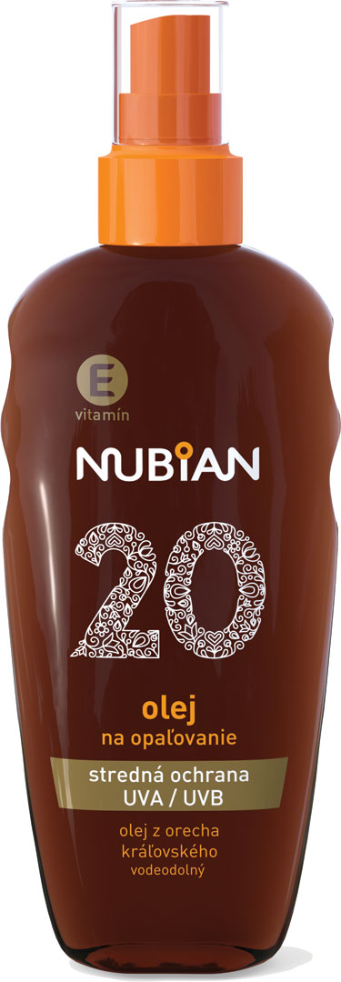Nubian vodeodolný olej na opaľovanie SPF 20. Kombinácia UVA/UVB filtrov - ochrana pokožky pred slnečným žiarením. Olej z orecha kráľovského - výživa pokožky. Vitamín E - antioxidant, ochrana buniek a regenerácia pokožky. Použitie: Na ochranu celého tela nanášajte olej rovnomerne v množstve 6 čajových lyžičiek na suchú pokožku 15 minút pred opaľovaním. Vyhýbajte sa oblasti okolo očí. Aplikácia menšieho množstva znižuje úroveň ochrany. Nanášanie počas dňa pravidelne opakujte, najmä po potení, plávaní alebo osušení uterákom.