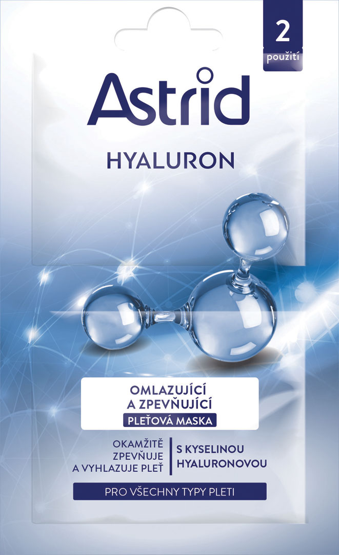 Astrid Hyaluron Omladzujúca a spevňujúca pleťová maska s kyselinou hyalurónovou okamžite spevňuje a vyhladzuje pleť a dodáva jej zdravý vzhľad. Zloženie obohatené o kolagén zlepšuje pevnosť a pružnosť pleti, zanecháva ju jemnú, omladenú a žiarivú.