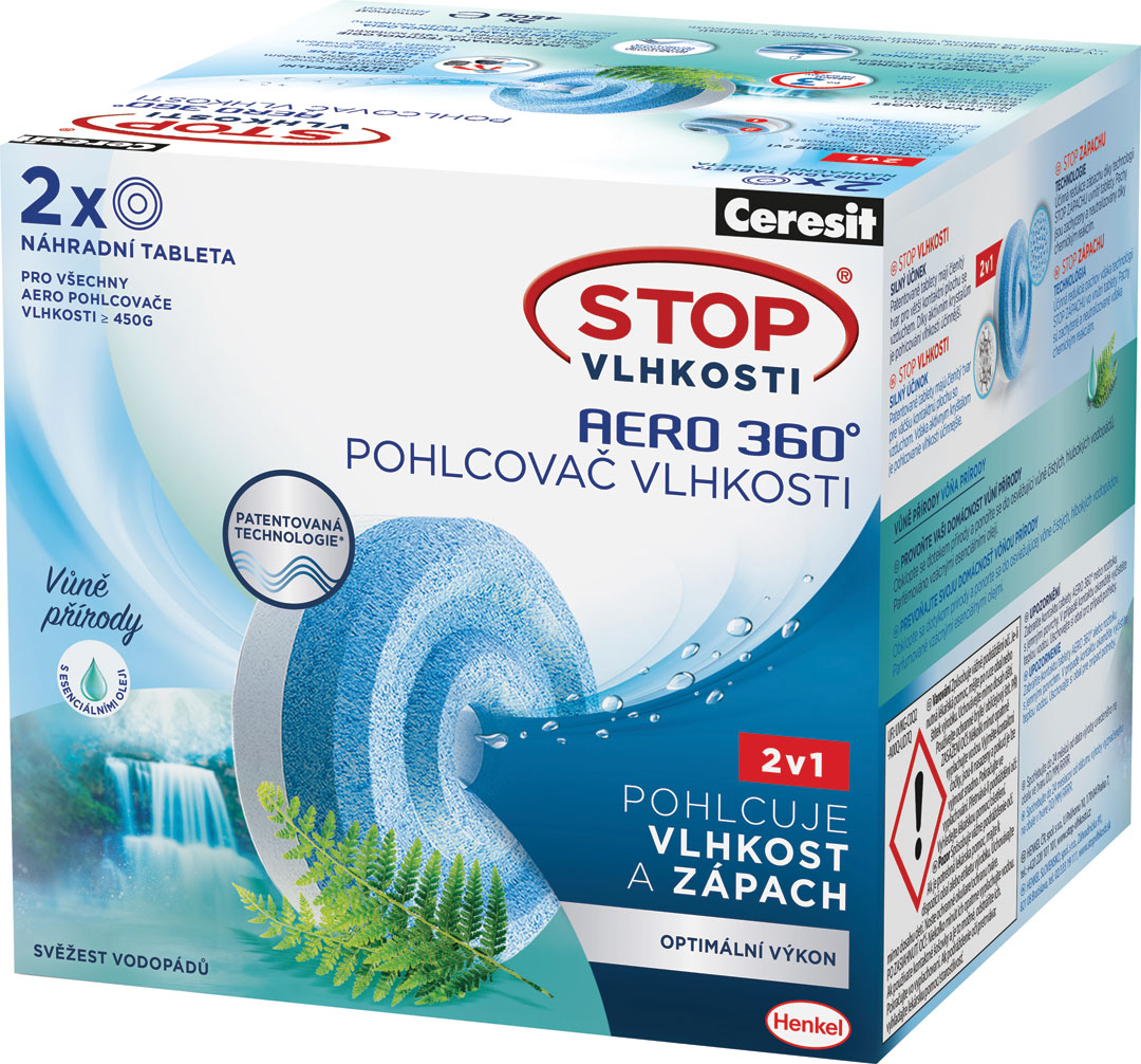 STOP VLHKOSTI AERO 360° náhradné náplne eliminujú prebytočnú vlhkosť a pomáhajú neutralizovať nepríjemný zápach. Vďaka členitému povrchu a otvoru vo vnútri tablety sa zvýšil účinok pohlcovania až o 40%. Zložka v modrej časti tablety neutralizuje nepríjemný zápach až o 70%. Tablety optimalizujú vzdušnú vlhkosť - okamžitý účinok viditeľný už po 12 hodinách. Obklopte sa dotykom prírody a ponorte sa do vône čistých, hlbokých vodopádov. Tablety pohlcujú nadmernú vlhkosť, neutralizujú zápach a osviežia priestor ľahkou vôňou prírody. Ekologicky šetrný obal - 100% recyklovaný a opätovne recyklovateľný kartónový obal. Trvanlivosť tablety je cca 2-4 mesiace, v závislosti od teploty v miestnosti a relatívnej vlhkosti vzduchu. Kompatibilné s Pohlcovačom vlhkosti AERO 360°, vč. Pohlcovača AERO 360° do kúpeľne.