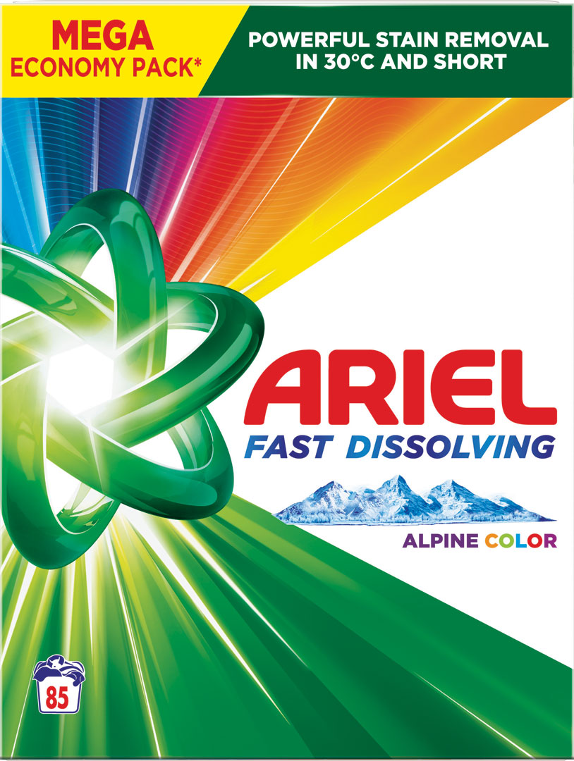 Ariel, ktorý odporúčajú značky Whirlpool, Electrolux, Candy a Beko, predstavuje rýchlorozpustný prášok na pranie Ariel Alpine Color. Ariel prášok na pranie účinne odstraňuje škvrny už pri 30 °C a v krátkych cykloch. Vďaka jedinečnej technológii rýchleho rozpúšťania sa pri kontakte s vodou rýchlo rozpustí a okamžite aktivuje, a preniká hlboko do vlákien, dokonca aj pri nízkych teplotách. Znížte teplotu prania na 30 °C a ušetrite až 60 % energie! (Spotreba energie práčky, zníženie teploty vody zo 60 °C na 30 °C, normálny cyklus). Cykly so studenou vodou pomáhajú chrániť bielizeň dlhšie v porovnaní s cyklami s teplou vodou.
