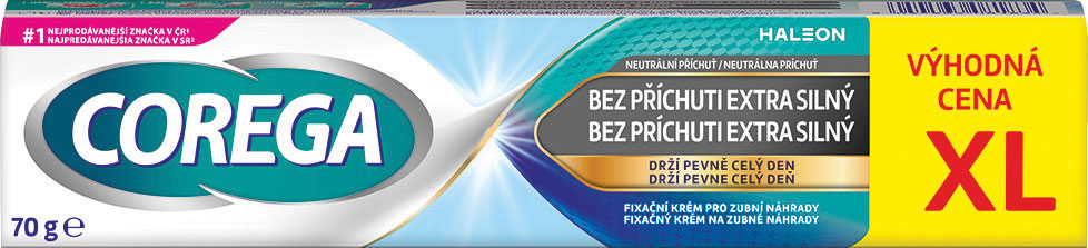 Fixačný krém bez príchuti na čiastočné a celkové zubné náhrady Corega Original XL extra silný poskytuje v porovnaní bez použitia fixačného krému veľmi pevnú fixáciu zubnej náhrady a to po dobu až 12 hodín. Tento fixačný krém na zubné protézy obsahuje systém dvoch polymérov, ktorý zlepšuje retenciu a stabilitu pri najlepšie padnúcich zubných náhradách, zlepšuje účinnosť žuvania, pomáha zvýšiť utesnenie zubnej náhrady a zabrániť prenikaniu jedla pod zubnú náhradu a zároveň zvyšuje silu zhryzu. Vhodné na každodenné použitie.