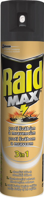 Insekticíd v spreji Raid je účinný v boji proti lezúcemu hmyzu, ako sú šváby a mravce. Pôsobí v priebehu niekoľkých sekúnd a zaručuje dlhotrvajúcu ochranu. Zároveň zabíja aj vajíčka hmyzu. Ošetreným povrchom poskytuje Raid insekticíd v spreji ochranu až po dobu 4 týždňov.
