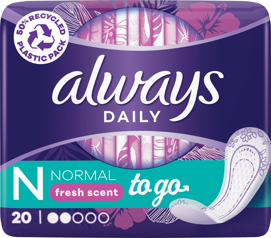 Nezáleží na tom, kam vás život zavedie, intímky Always Dailies Normal To Go udržia pocit sviežosti každý deň. Vďaka kompaktnému baleniu ich môžete nosiť so sebou po celý deň a cítiť sa sviežo, kamkoľvek pôjdete. Jednotlivo balené pre lepšie pohodlie a hygienu pri nosení v kabelke. Ideálne na zachytávanie vaginálneho výtoku alebo ako dodatočná ochrana pri nepravidelnej a slabšej menštruácii či miernom výtoku.