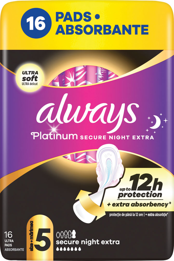 Vložky s ultra jemnou ochrannou vrchnou vrstvou pre neuveriteľné pohodlie a ochranu pred pretečením. Technológia InstantDry pre ešte viac pohodlia. Jemný a flexibilný dizajn, ktorý sa prispôsobí vášmu telu. O 85 % širšia a väčšia zadná časť* pre extra ochranu tam, kde ju potrebujete najviac. * V porovnaní s Platinum veľkosť 1. Vložky Always Platinum s ultra jemnou ochrannou vrchnou vrstvou sú navrhnuté tak, aby predchádzali pretečeniu zostali na mieste a poskytovali optimálne pohodlie. Vďaka vložkám Always Platinum bude menštruácia tou poslednou vecou na ktorú budete myslieť.Always Platinum Secure Night Extra (veľkosť 5) sa odporúča používať v noci. Majú o 85 % širšiu a väčšiu zadnú časť* pre extra ochranu pred pretečením. * V porovnaní s Platinum veľkosť 1. Vyskúšajte Always Platinum Super Extra (veľkosť 3)ktoré vás ochránia počas dňa.