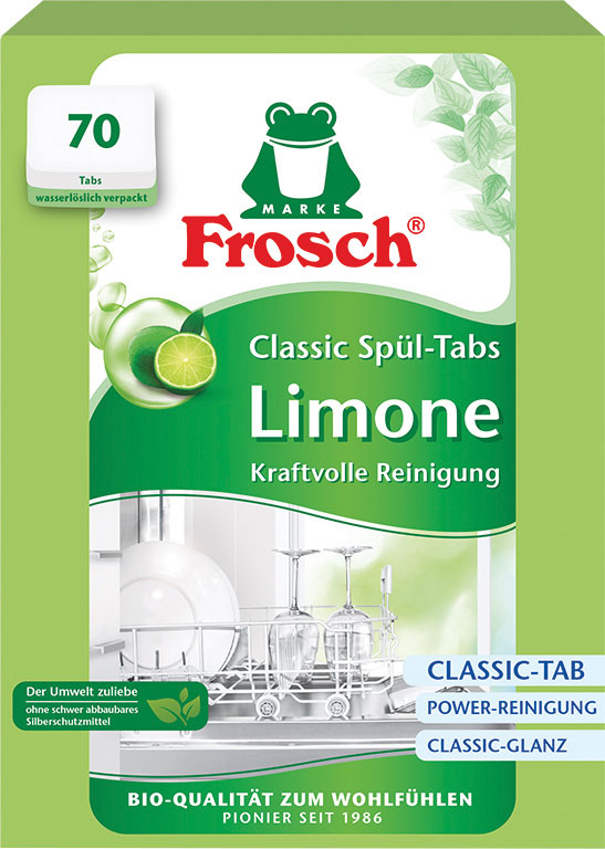 Frosch tablety do umývačky s limetkovou vôňou zanechajú váš riad žiarivo čistý. V ekologickom, znovu uzatvárateľnom balení z 95 % recyklovaného a opakovane recyklovateľného kartónu.