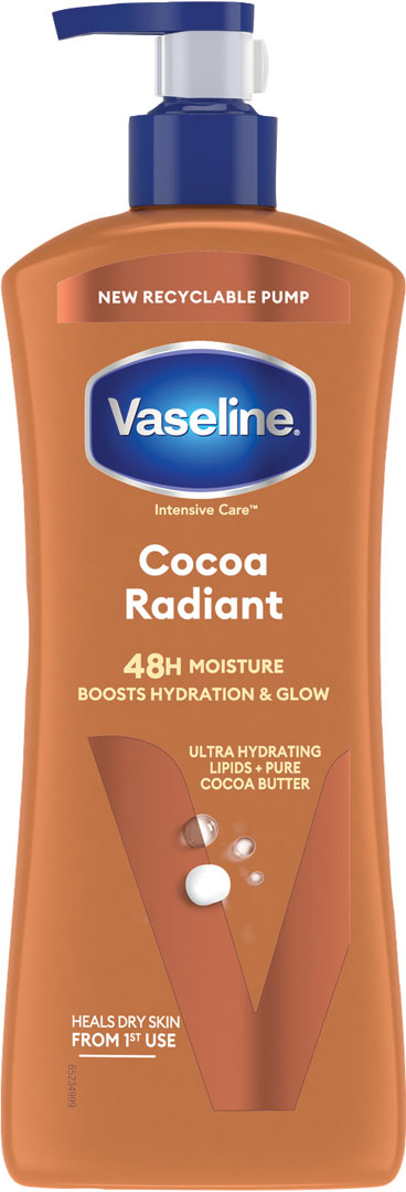Vaseline telové mlieko Cocoa Radiant obsahuje čisté kakaové maslo a je navrhnuté tak, aby rozjasnilo mdlú pokožku a zároveň ju hĺbkovo hydratovalo. Rýchlo sa vstrebáva a nezanecháva pocit mastnoty. Zabezpečí vašej pokožke 48-hodinovú hydratáciu a dlhotrvajúce rozjasnenie.