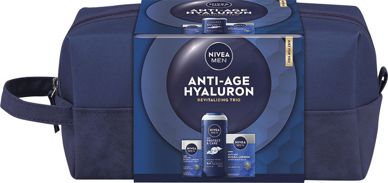 Darčeková sada obsahuje: Men balzam po holení Hyaluron 100 ml, Men hydratačný krém proti vráskam 50 ml, Men sprchovací gél Protect&Care 250 ml