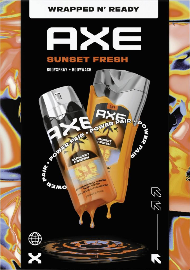 Axe balíček je tu pre každého muža, ktorý vie oceniť eleganciu a prahne za skvelou vôňou. Sofistikovaná vôňa využíva to najlepšie z prírody a kombinuje neodolateľnú vôňu palmových listov a ambry. AXE Sunset Fresh ťa prevedie akýmkoľvek každodenným dobrodružstvom! Vianočný balíček pre mužov Axe Sunset Fresh prináša mix dezodorantu a sprchovacieho gélu, ktorý zaručí sviežosť, dlhodobú vôňu a príliv sebavedomia.