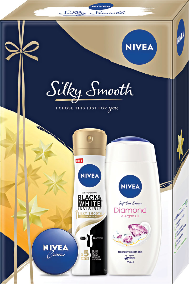 Rozmaznávajte svojich blízkych! Darčeková kazeta Nivea Silky Smooth obsahuje produkty pre dokonalú starostlivosť o telo a pleť. Darčekový balíček obsahuje 3 produkty: klasický a obľúbený krém Nivea, ktorý sa skvele hodí na tvár aj telo. Pokožku vyživí, zjemní a zanechá na nej hodvábne jemný pocit. V balení ďalej nájdete dámsky antiperspirant v spreji Black & White Invisible Silky Smooth a tiež ošetrujúci sprchovací gél Diamond, ktorý vašu pokožku nielen vyčistí, ale aj ošetrí a prevonia. Vaša pokožka bude hebká, jemná a decentne voňavá. Ideálny darček na zimné obdobie! Darujte vašej milovanej osôbke toto dokonalé balenie Nivea!