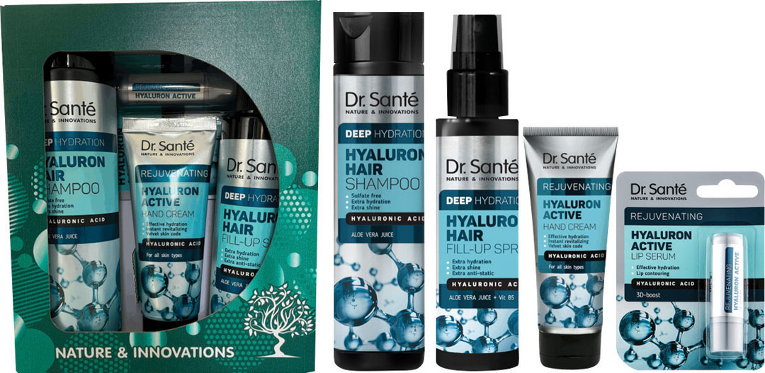Hyaluron active krém na ruky a nechty 75ml - Aqua, Coco-Caprylate, Cetearyl Ethylhexa- noate, Glycerin, Glyceryl Stearate SE, Glyceryl Stearate, Cetearyl Alcohol, Butyrospermum Parkii Butter, Sodium Hyaluronate, Sodium Acrylates Copolymer, Lecithin, Bis-PEG-18 Methyl Ether Dimethyl Silane, Parfum, Phenoxyethanol, 1,2-Hexanediol, Caprylyl Glycol, Hyaluron spray 150ml - Aqua, Bis-Cetearyl Amodimethicone, Sodium Hyaluronate, Hydrolyzed Hyaluronic Acid, Aloe Barbadensis Leaf Juice, Sodium PCA, Sodium Lactate, Arginine, Aspartic Acid, PCA, Glycine, Alanine, Serine, Valine, Proline Threonine, Isoleucine, Histidine, Phenylalanine, Panthenol Polysorbate 20, Silicone Quaternium-18, Trideceth-6,Tride ceth-12, Ceteareth-7, Ceteareth-25, Parfum, Citric Acid Glycolic Acid, Potassium Sorbate, Sodium Benzoate, Lactic Acid, Phenoxyethanol, Ethylhexylglycerin, Caprylyl Glycol Hexyl Cinnamal, Limonene, Geraniol, Hyaluron šampón 250ml - Aqua, Sodium C14 16 Olefin Sulfonate, Cocamidopropyl Betaine, Lauryl Glucoside, Cocamide MEA, Coco-Betaine, Sodium Hyaluronate, Hydrolyzed Hyaluronic Acid, Aloe Barbadensis Leaf Juice, Sodium Methyl Cocoyl Taurate, Sodium Cocoyl Isethionate, PPG-3 Caprylyl Ether, Quaternium-80, Hydroxypropyl Guar Hydroxypropyltrimonium Chloride, Maltooligosyl Glucoside, Hydrogenated Starch Hydrolysate, Sodium Chloride, Propylene Glycol, Parfum, Tetrasodium Glutamate Diacetate, Citric Acid, Potassium Sorbate, Sodium Benzoate, Phenoxyethanol, Lactic Acid, Hexyl Cinnamal, Limonene, Sodium Sulfate, Sodium Chloride, CI 42090, Hyaluron active balzám na pery 3,6g - Hellanthus Annuus Seed Oil, Ricinus Communis Seed Oil, Caprylic/Capric Triglycadde Paraffin, Macadamia Temifolia Seed Oil, Glyceryl Palmitate/Stearate, Copemicia Cerifera Cers, Stearic Acid, Helanthus Amuse Seed Cera, Palmitic Acid, Synthetic Wax, Cera Alba, Cetyl Palmitate, Parfum, Ethylhexyl Palmitate, Tribohemin, Sort Palmitoyl Tripeptide-1, Tocopheryl Acetate, Glycerin, Glucosyl Ceramide, Squalane, Pentylene Glycol, Sodium Hysk Tocopherol, Limonene, Linalool, Geraniol, Hexyl Cinnamal, Citral