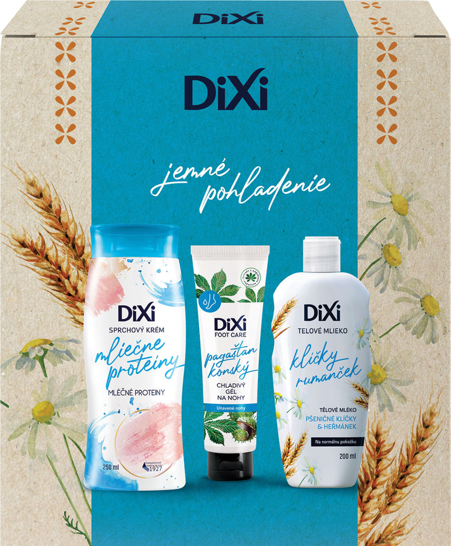 Dixi set Šťavnatá odmena obsahuje: Dixi sprchový gél Pomaranč a Grep 250 ml, Dixi Foot Care zmäkčujúci krém na nohy 100 g, Dixi telové mlieko Avokádo a Mandľa 200 ml.