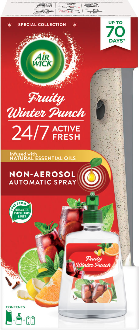 Air Wick Active Fresh Zimný punč neutralizuje nepríjemné pachy - či už pochádzajú z kuchynských vôní, kúpeľne, od domácich miláčikov, odpadkov či plesní. S tromi nastaviteľnými intenzitami vône môžete ľahko prispôsobiť sviežosť podľa vášho vkusu. Air Wick Active Fresh Zimný punč zabezpečí až 70 dní neustálej vône, aby váš domov zostal dlhodobo príjemne prevoňaný. Premeňte váš domov na oázu pokoja a pohody s Air Wick.