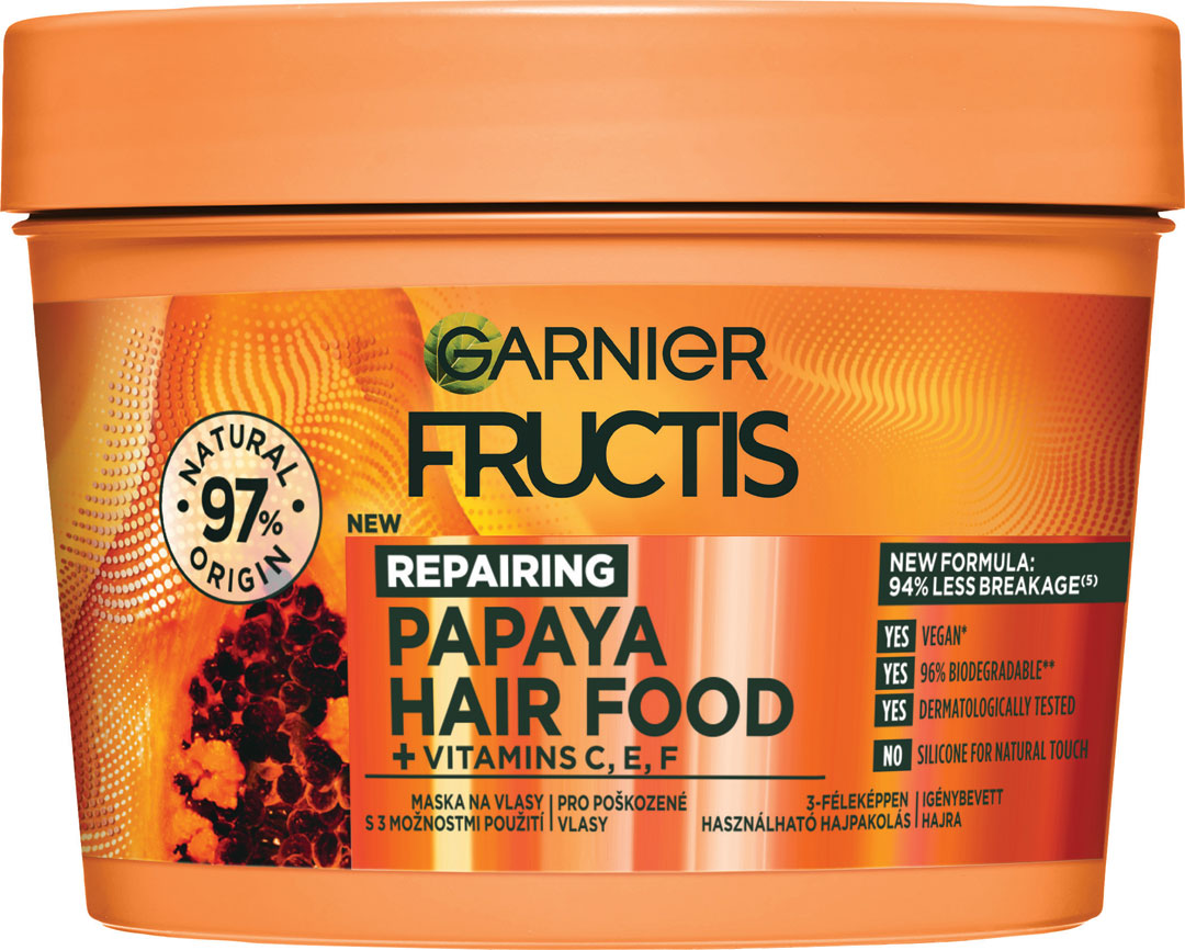 Maska na poškodené vlasy obohatená o vitamíny C, E a F s 3 možnosťami použitia. 1. Balzam na vlasy 2. Maska na vlasy 3. Bezoplachová starostlivosť Až o 94 % menej lámavosti (1). Zloženie je z 97 % prírodného pôvodu. Zvyšné 3 % zaručujú senzorické vlastnosti a stabilitu produktu. (1) Inštrumentálny test po aplikácii masky a následnom opláchnutí.