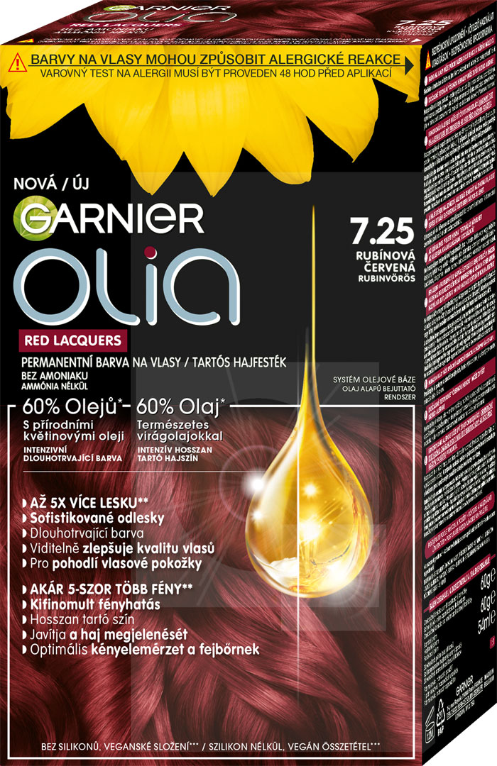 Olia od Garnier je dlhotrvajúca permanentná farba na vlasy obohatená o 60 % olejov, pričom neobsahuje amoniak ani silikóny. Technología olejovej bázy prináša farbu hlboko do srdca vlasového vlákna a zaisťuje neobyčajne sytý výsledok. Súčasťou balenia je teraz aj aplikátor, ktorý uľahčuje aplikáciu. Olia kryje až 100 % šedín. Jej intenzívna starostlivosť viditeľne zlepšuje kvalitu vlasov a prináša komfort pokožke hlavy.