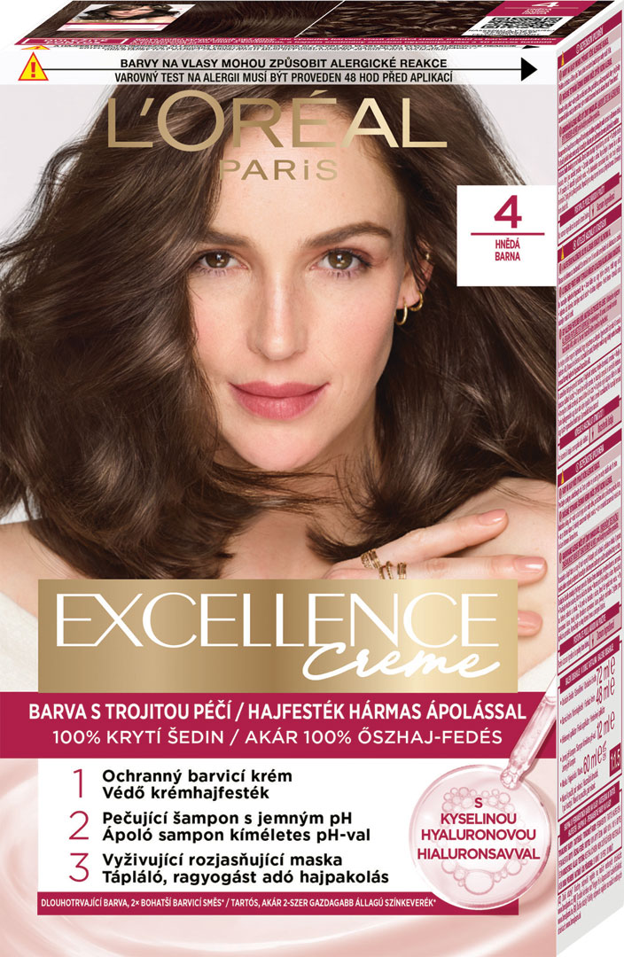 Permanentná farba obohatená o ochranné zložky. L'Oréal Paris Excellence prináša rituál farbenia s trojitou ochranou obohatený o kyselinu hyalurónovú, pričom sa stará o vašu farbu, pokožku hlavy aj o vaše vlasy. S novým jemným ošetrujúcim pH šampónom po farbení budú vaše vlasy hladké a plné lesku s prirodzene vyzerajúcou farbou. Kryje 100 % šedín. Kyselina hyalurónová je účinná molekula zachytávajúca hydratáciu, prirodzene prítomná v tele, so schopnosťou zadržať vodu až v 1000-násobku svojej hmotnosti. Ako pôsobí vo farbách na vlasy? 1. V ochrannom farbiacom kréme dodáva vlasom hĺbkovú hydratáciu a 2× bohatší farebný výsledok*. 2. Vo vyživujúcej maske prináša až 10x viac hydratácie** pre dlhodobo žiarivú farbu. * V porovnaní s pôvodnou zmesou (farbiaci krém + oxidačné činidlo), inštrumentálny test viskozity. ** Inštrumentálny test.