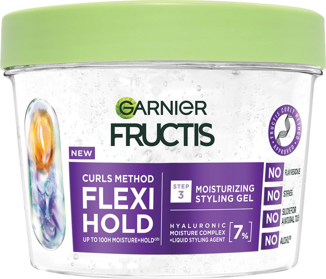 Kučeravé vlasy majú krehkú špirálovú štruktúru, ktorá prepúšťa vlhkosť v každom zatočení. S novým hydratačným stylingovým gélom Garnier Fructis Curls Method Flexi Hold krok 3 okamžite hydratuje, definuje tvar vĺn a kučier, poskytuje dlhotrvajúcu fixáciu. Obsahuje [7%] HYDRATAČNÝ HYALURÓNOVÝ KOMPLEX + TEKUTÁ STYLINGOVÁ ZLOŽKA Neobsahuje alkohol(1) Vlny a kučery sú viditeľne transformované s intenzívnou hydratáciou a elastickou definíciou bez šupinatých zvyškov. Flexibilná definícia umožňuje prirodzený pohyb bez zaťaženia. 100h odolnosti proti otlačeniu od vankúša a vlhkosti. Žiadne šupinaté zvyšky, nezaťažuje, nemastí. HYDRATUJE, DEFINUJE A FIXUJE SUCHÉ VLNITÉ A KUČERAVÉ VLASY AŽ NA 100 H (2) ODOLÁ AŽ 100 H PROTI OTLAČENIU OD VANKÚŠA A VLHKOSTI (3) FRUCTIS CURLS METHOD: VYVINUTÉ, TESTOVANÉ A SCHVÁLENÉ PRE VŠETKY TYPY VLNITÝCH A KUČERAVÝCH VLASOV (2) BEZ silikónov pre prirodzený vzhľad SCHVÁLENÉ ORGANIZÁCIOU CRUELTY-FREE INTERNATIONAL. VEGÁNSKE ZLOŽENIE(3). VYROBENÉ V TOVÁRNI, KTORÁ DOSIAHLA 100% OBNOVITEĽNÚ ENERGIU(5). (1)Žiadny etylalkohol. (2)Spotrebiteľský test na 65 ľuďoch. (3)Inštrumentálny test. (4)Žiadne zložky živočíšneho pôvodu. (5)S výnimkou bezpečnostných a zabezpečovacích inštalácií.