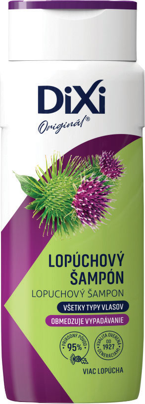 Dixi Šampón Lopúchový s extraktom z koreňa lopúcha väčšieho je určený na všetky typy vlasov. Pri pravidelnom používaní obmedzuje vypadávanie vlasov a napomáha udržiavať ich zdravý vzhľad. Použitie: Na mokré vlasy naneste potrebné množstvo šampónu, vmasírujte, vlasy umyte a dôkladne opláchnite. Podľa potreby postup zopakujte. Po umytí odporúčame vlasy ošetriť kondicionérom.