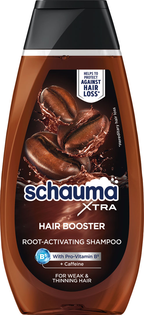 Šampón Schauma Hair Booster pomáha chrániť pred vypadávaním vlasov* a zároveň vlasy čistí. Tento šampón s kofeínom aktivuje vlasové korienky a predlžuje fázu rastu vlasov. S provitamínom B5, ktorý vyživuje vlasy od korienkov až po končeky. Výsledok? Slabé a rednúce vlasy sú čisté a silné od korienkov až po končeky.