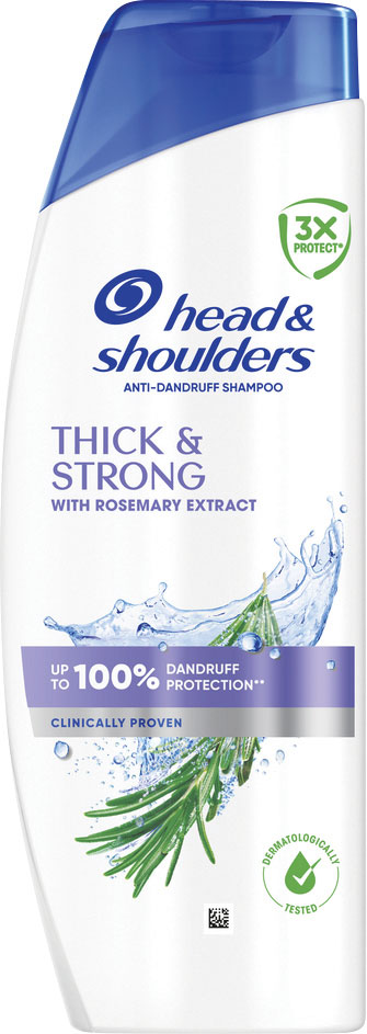 Head & Shoulders Šampón Proti Lupinám Thick & Strong s Výťažkom z Rozmarínu poskytuje vynikajúcu účinnosť a zároveň sa stará o pokožku hlavy. Jeho zloženie s 3-násobnou ochranou* obsahujúce piroktón olamín pôsobí priamo tam, kde problém vzniká, a účinkuje proti 3 problémom s pokožkou hlavy* od úplne prvého umytia. Je klinicky overený a dermatologicky testovaný a ponúka až 100 % ochranu proti lupinám**a je ideálny na každodenné používanie. * Účinkuje proti 3 problémom s pokožkou hlavy: lupinám, svrbeniu súvisiacemu s lupinami a mastnote. ** Pri pravidelnom používaní