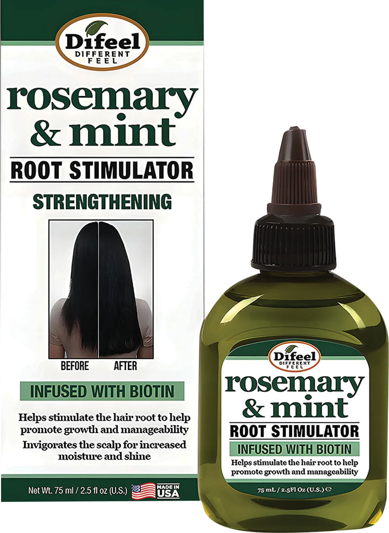 Výživné sérum Difeel Root Stimulator Rosemary Mint obsahujúce rozmarín a mätu stimuluje pokožku hlavy v oblasti vlasových korienkov, podporuje tak rast vlasov a zvyšuje ich pevnosť, upraviteľnosť a lesk.