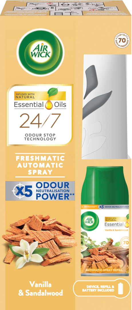 Osviežovač vzduchu Air Wick Fresh Matic s náplňou vône vanilky a santalového dreva, s ktorým ľahko osviežite váš domov. Prístroj automaticky prevonia miestnosť podľa nastavenej intenzity, čím neutralizuje nepríjemné pachy až na 70 dní.