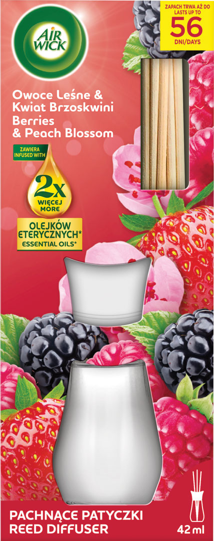 Povznášajúca zmes malín, červeného ovocia a broskyňového kvetu, napustená šumivými tónmi citrusových plodov a náznakmi vanilky, poskytuje osviežujúco šťavnatý zážitok. Air Wick vonné tyčinky využívajú prírodné ratanové stonky na jemné rozptyľovanie nádhernej vône. Vytvorte si doma príjemnú atmosféru vďaka prirodzenej vôni a elegantnému dizajnu. Vôňa je obohatená o dvojnásobné množstvo prírodných esenciálnych olejov v porovnaní s predchádzajúcim zložením vonných tyčinek Air Wick. Vydrží až 56 dní.