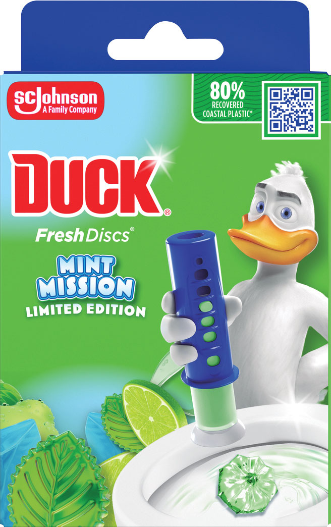 MINT MISSION - iskrivá a hravá vôňa, svieže citrusy, a aromatická mäta. WC gél DUCK Fresh Discs dokonale vyčistí vašu toaletu a spoľahlivo ju ochráni pred vodným kameňom pri každom spláchnutí. Stačí iba aplikovať na vnútornú stenu misy a gélový disk bude pracovať za vás. WC gél DUCK Fresh Discs prevonia celú miestnosť príjemnou vôňou. Náplň vydrží cca 6 týždňov alebo 600 spláchnutí. V balení nájdete hygienický aplikátor a náplň so 6 gélovými diskami.