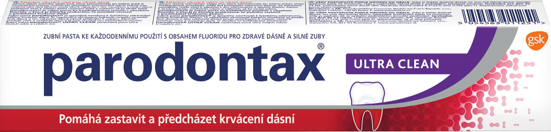Zubná pasta Parodontax Ultra Clean bola špeciálne vyvinutá na pomoc pri krvácaní ďasien. Krvácanie ďasien pri čistení zubov je jasným signálom ochorenia, ktoré môže viesť od zápachu z úst, cez začervenanie, opuch a ustupovanie ďasien, až po vypadávanie zubov. Parodontax Ultra Clean zubná pasta proti problémom s ďasnami účinne pôsobí proti ich príčinám. Dodáva pocit perfektne čistých zubov a prispieva k sviežemu dychu.
