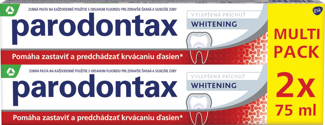 Zubná pasta Parodontax Whitening pomáha odstraňovať škvrny zo zubnej skloviny a účinne navracať belosť. Bola špeciálne vyvinutá na pomoc pri krvácaní ďasien. Krvácanie ďasien pri čistení zubov je jasným signálom ochorenia, ktoré môže viesť od zápachu z úst, cez začervenanie, opuch a ustupovanie ďasien, až po vypadávanie zubov. Parodontax Whitening zubná pasta proti problémom s ďasnami účinne pôsobí proti ich príčinám. Aktívne posilňuje zuby a prispieva k sviežemu dychu.