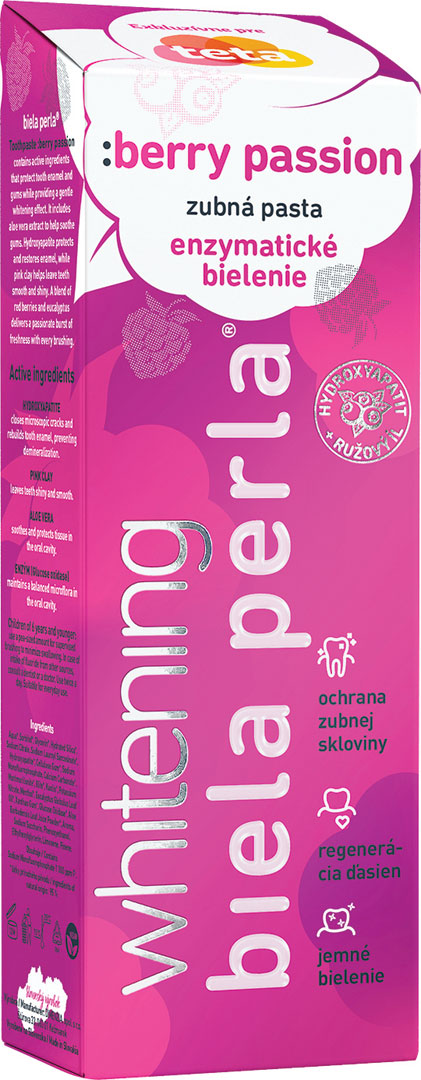Biela Perla Zubná pasta: Berry Passion obsahuje účinne látky na ochranu zubnej skloviny a ďasien s jemným bieliacim účinkom. Obsahuje výťažok z aloe vera, ktorý pôsobí upokojujúco na ďasná. Hydroxyapatit ochraňuje a obnovuje zubnú sklovinu a ružový íl pomáha zanechávať zuby lesklé a hladké. Kombinácia bobúľ červeného ovocia a eukalyptu prináša vášnivú sviežosť pri umývaní zubov.
