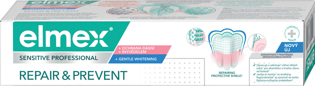 Zubná pasta elmex® Sensitive Professional Repair & Prevent + Gentle Whitening s technológiou PRO-ARGIN pre úľavu od bolesti citlivých zubov. Táto zubná pasta na citlivé zuby poskytuje okamžitú úľavu* tým, že uzatvára a opravuje malé kanáliky vedúce k zubnému nervu, kde vzniká bolestivá citlivosť. Uzatvorením týchto dentínových kanálikov chráni pred citlivosťou a pri pravidelnom používaní vytvára ochrannú vrstvu** na dlhodobú ochranu a posilnenie ďasien. Zloženie obsahuje zinok, ktorý pomáha posilňovať ďasná a predchádzať ich ústupu, ktorý môže byť hlavnou príčinou citlivosti.