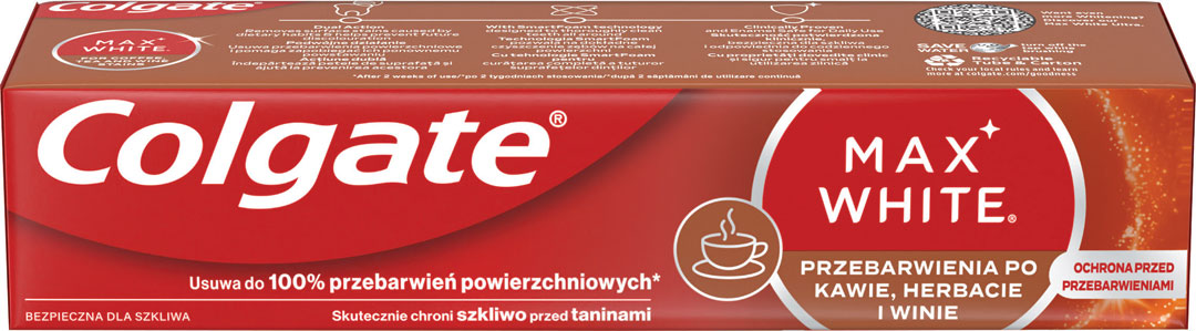 Získajte žiarivý úsmev so zubnou pastou Colgate Max White For Coffee, Tea & Wine. Táto bieliaca zubná pasta má klinicky overené zloženie, ktoré odstraňuje až 100 % povrchových škvŕn* a zanecháva vám žiarivý úsmev. Vďaka technológii SmartFoam je táto zubná pasta navrhnutá tak, aby dôkladne čistila všetky zuby a zároveň účinne chránila sklovinu pred tanínmi.