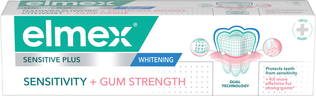 Starajte sa o citlivé zuby a ďasná čistením zubnou pastou elmex Sensitivity + Gum Care Whitening. Citlivé zuby a podráždené ďasná sa môžu objaviť súčasne, čo môžu byť prvé príznaky väčších problémov v ústnej dutine a môžu vás zanechať v nepohodlí. Preto by ste o ne mali dbať pomocou zubnej pasty pre citlivé zuby a ďasná, ako je zubná pasta elmex Sensitivity + Gum Care Whitening. Táto zubná pasta pre citlivé zuby obsahuje klinicky overené dvojité aktívne zloženie fluoridu cínatého a zinku, ktoré chráni citlivé zuby pri pravidelnom používaní. Zubná pasta tiež pomáha bojovať proti baktériám zubného plaku, ktorý je hlavnou príčinou krvácania a zápalu ďasien, a zároveň pomáha posilňovať ďasná. Špeciálne čistiace zloženie účinne odstraňuje zafarbenie zubov a pomáha obnoviť ich prirodzenú belosť.