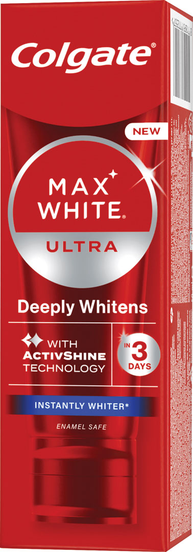 Dosiahnite dramatické výsledky s okamžitým* a hlbokým bielením už za 3 dni! Predstavujeme zubnú pastu Colgate Max White Ultra Instantly Whiter, najnovšie riešenie pre dokonalé bielenie zubov. Táto technologicky pokročilá bieliaca zubná pasta, ktorá obsahuje to najlepšie z vedeckých poznatkov spoločnosti Colgate v oblasti bielenia, ide oveľa ďalej ako bežné bieliace zubné pasty, ktoré odstraňujú len povrchové škvrny. Bieli okamžite* a zameriava sa na odolné hlboké škvrny**, takže môžete zažiť silu skutočného bielenia zubov pomocou zubnej pasty. Vďaka inovatívnej technológii ActivShine vyhladzuje povrch skloviny, aby odrážala viac svetla a dosiahla prirodzene oslnivý výsledok.