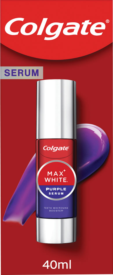 Objavte okamžité rozjasnenie* a sebavedomie s Colgate Max White Purple Serum. Naše fialové sérum pre intenzívnejšie bielenie zubov sa nanáša po čistení zubov a ponúka dvojitý účinok pre okamžitú korekciu farby* a dlhotrvajúce výsledky bielenia? !